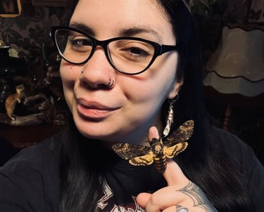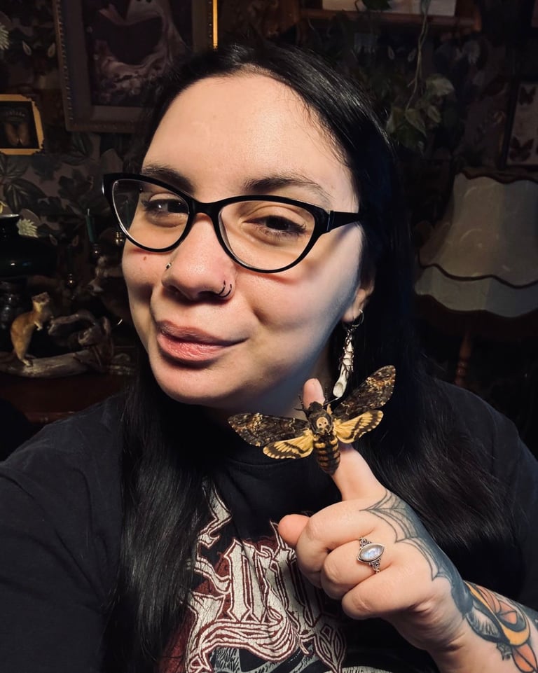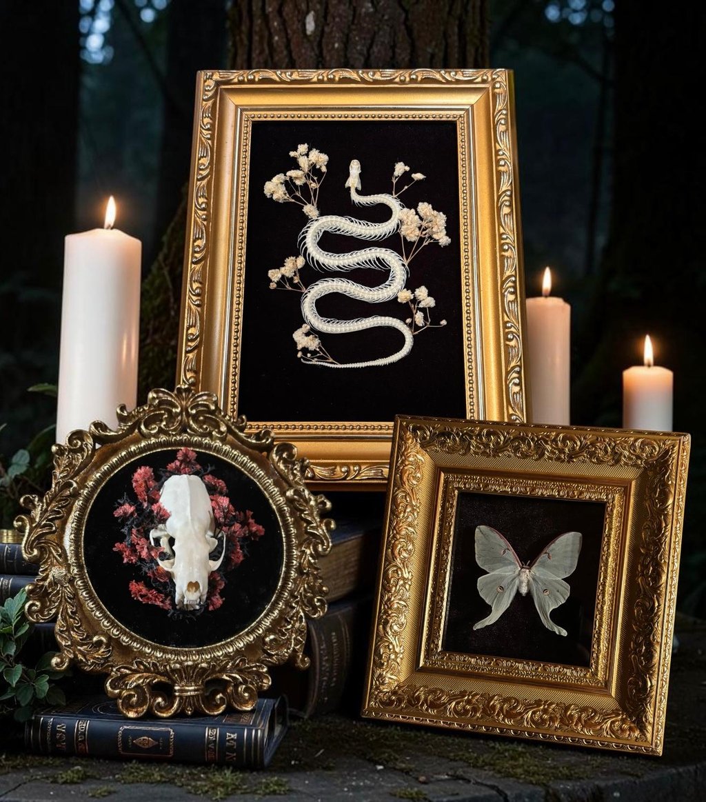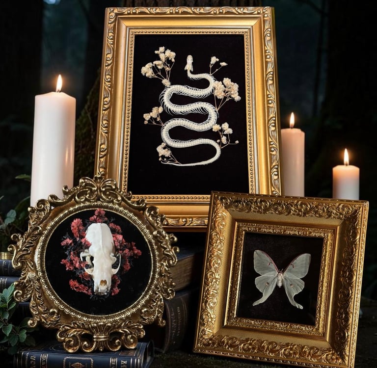 Every bug and bone you see here is what I call a "Forgotten Forest Relic." I love the idea that these pieces were just waiting to be found in another realm and brought over to ours. That's where the "Vintage Dark Botanical" vibe comes in: I want these to feel like something you'd find in a Victorian traveler's trunk if they had traveled through a portal to a goddess's forest It's a mix of all the best things: super moody vibes, deep blacks and forest greens, and those fancy, ornate gold frames that look like they were rescued from a haunted mansion. It's like a piece of a magical forest, but make it whimsy.